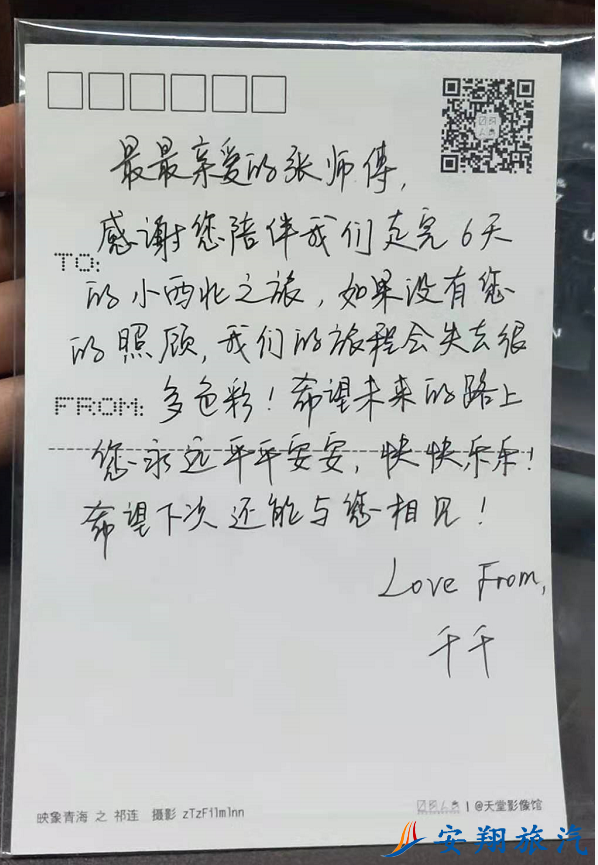 感謝您陪伴我們走完6天的小西北之旅,如果沒(méi)有您的照顧,我們的旅程會(huì)失去很多色彩!希望未來(lái)的路上您永遠(yuǎn)平平安安,快快樂(lè)樂(lè)!希望下次還能與您相見(jiàn)!