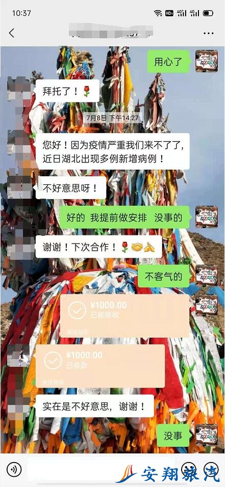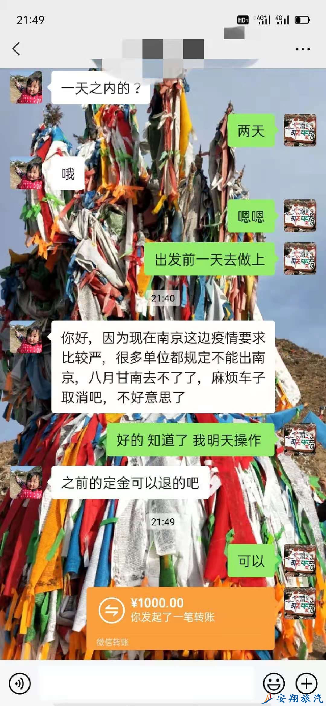 鄭州、南京受天災疫情影響,在旅游旺季取消車輛對我們影響很大,但是我們還是如數(shù)退還定金,保障客戶的合法權益。