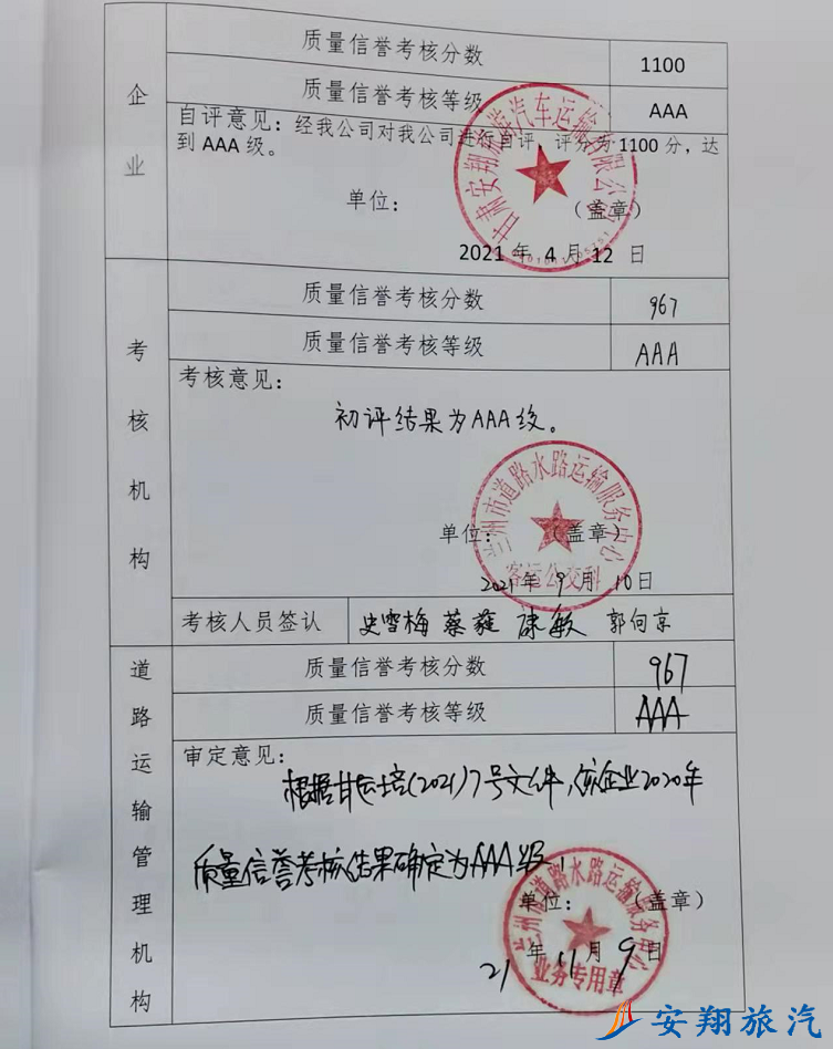 安翔旅汽2020年質(zhì)量信譽(yù)考核喜提AAA