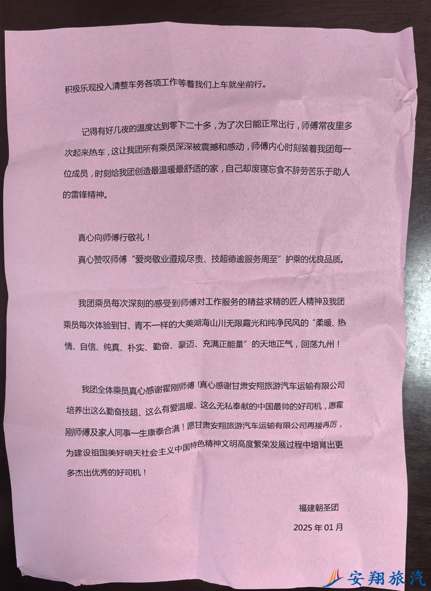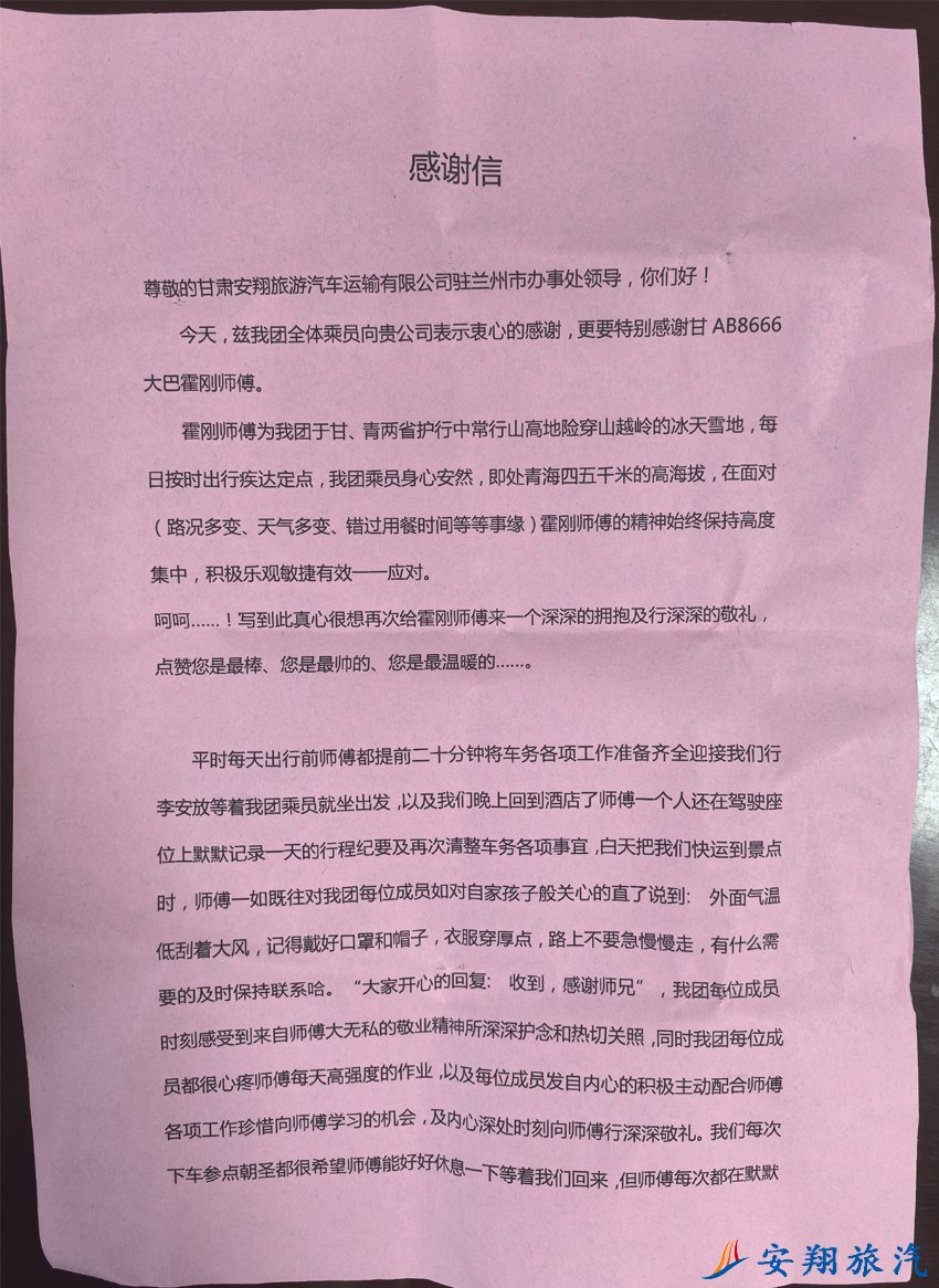 我團(tuán)全體乘員真心感謝霍剛師傅!真心感謝甘肅安翔旅游汽車(chē)運(yùn)輸有限公司培養(yǎng)出這么勤奮技超、這么有愛(ài)溫暖、這么無(wú)私奉獻(xiàn)的中國(guó)最帥的好司機(jī),愿霍剛師傅及家人同事一生康泰合滿(mǎn)!愿甘肅安翔旅游汽車(chē)運(yùn)輸有限公司再接再厲為建設(shè)祖國(guó)美好明天社會(huì)主義中國(guó)特色精神文明高度繁榮發(fā)展過(guò)程中培育出更多杰出優(yōu)秀的好司機(jī)!