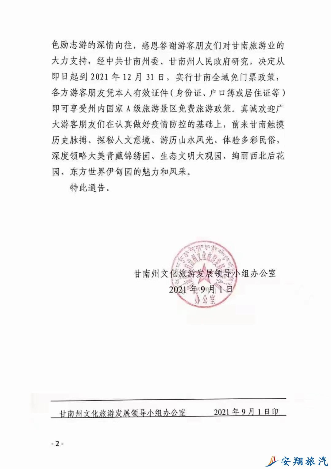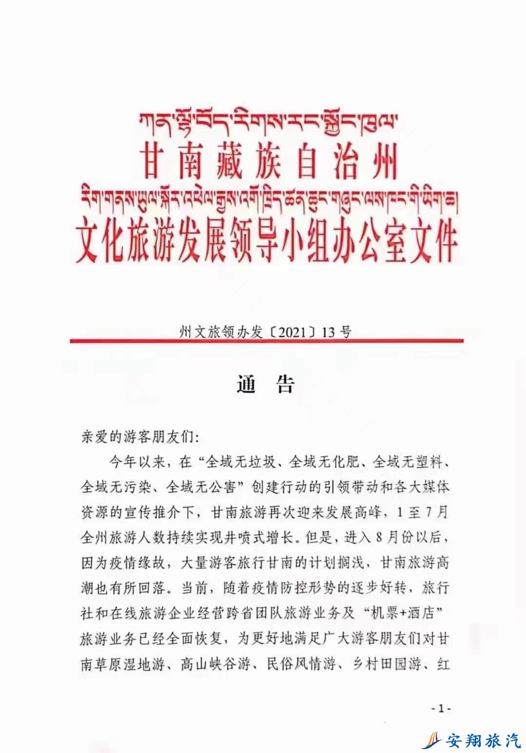 今年以來(lái),在“全域無(wú)垃圾、全域無(wú)化肥、全域無(wú)塑料、全域無(wú)污染、全域無(wú)公害”創(chuàng)建行動(dòng)的引領(lǐng)帶動(dòng)和各大媒體資源的宣傳推介下,甘南旅游再次迎來(lái)發(fā)展高峰,1至7月全州旅游人數(shù)持續(xù)實(shí)現(xiàn)井噴式增長(zhǎng)。但是,進(jìn)入8月份以后,因?yàn)橐咔榫壒剩罅坑慰吐眯懈誓系挠?jì)劃擱淺,甘南旅游高潮也有所回落。當(dāng)前,隨著疫情防控形勢(shì)的逐步好轉(zhuǎn),旅行社和在線旅游企業(yè)經(jīng)營(yíng)跨省團(tuán)隊(duì)旅游業(yè)務(wù)及“機(jī)票+酒店”旅游業(yè)務(wù)已經(jīng)全面恢復(fù),為更好地滿足廣大游客朋友們對(duì)甘南草原濕地游、高山峽谷游、民俗風(fēng)情游、鄉(xiāng)村田園游、紅色勵(lì)志游的深情向往,感恩答謝游客朋友們對(duì)甘南旅游業(yè)的大力支持,經(jīng)中共甘南州委、甘南州人民政府研究,決定從即日起到2021年12月31日,實(shí)行甘南全域免門(mén)票政策,各方游客朋友憑本人有效證件(身份證、戶(hù)口簿或居住證等)即可享受州內(nèi)國(guó)家A級(jí)旅游景區(qū)免費(fèi)旅游政策。真誠(chéng)歡迎廣大游客朋友們?cè)谡J(rèn)真做好疫情防控的基礎(chǔ)上,前來(lái)甘南觸摸歷史脈搏、探秘人文意境、游歷山水風(fēng)光、體驗(yàn)多彩民俗,深度領(lǐng)略大美青藏錦繡園、生態(tài)文明大觀園、絢麗西北后花園、東方世界伊甸園的魅力和風(fēng)采。