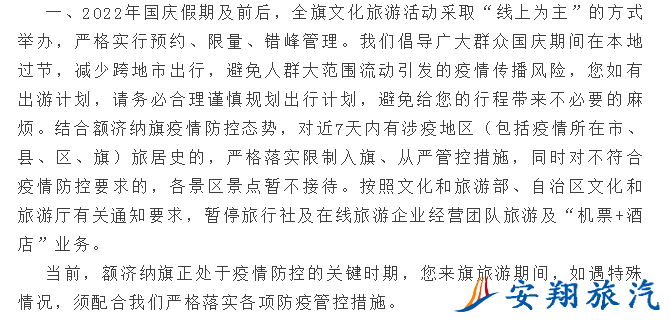 意思就是還是限制游覽,限制來旗人員的行程碼、48小時(shí)核酸、限制人流量及車流量!限制團(tuán)隊(duì);入旗人員提前微信小程序注冊(cè):阿拉善健康寶。游客抵達(dá)額濟(jì)納旗后進(jìn)入景區(qū)景點(diǎn)游覽,須出示健康碼、行程碼、24小時(shí)核酸檢測(cè)陰性證明,憑景區(qū)景點(diǎn)電子門票預(yù)約碼或完成預(yù)約的本人身份證掃碼入園。