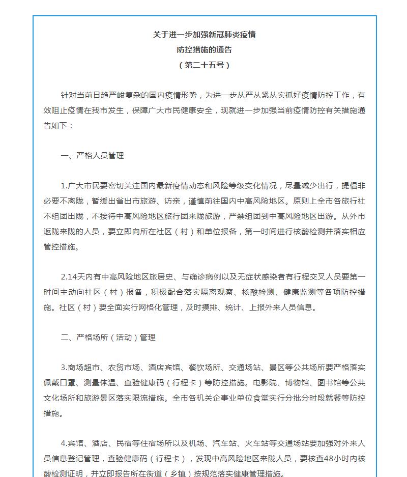 針對(duì)當(dāng)前日趨嚴(yán)峻復(fù)雜的國(guó)內(nèi)疫情形勢(shì),為進(jìn)一步從嚴(yán)從緊從實(shí)抓好疫情防控工作,有效阻止疫情在我市發(fā)生,保障廣大市民健康安全,現(xiàn)就進(jìn)一步加強(qiáng)當(dāng)前疫情防控有關(guān)措施通告如下......【點(diǎn)擊詳情】